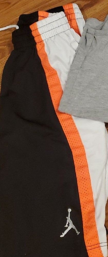 This is for a sz large blue and orange Nike shirt, grey medium mesh Jordan shorts, Nike medium grey sweatpants, Jordan medium black and neon orange basketball shorts, . No stains or snags. I do bundle and combine shipping to give you the best deal and save you money. Make me a reasonable offer on anything.