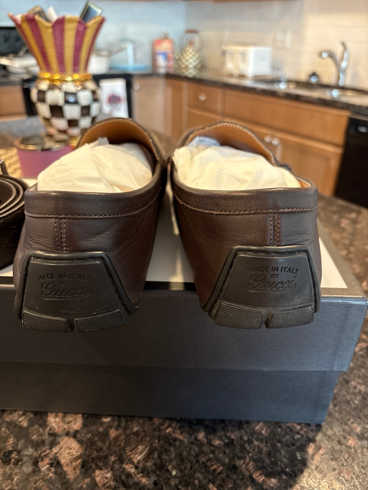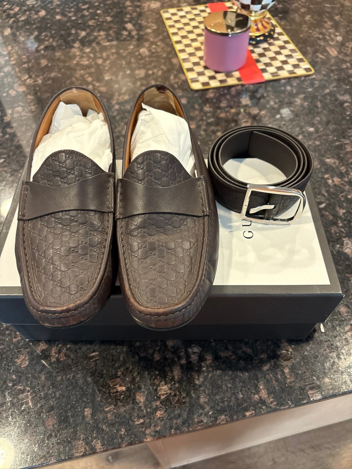 Men’s very handsome Gucci belt and driver shoes shoes are a men’s 10 and belt is a 100/40. My husband can wear a 34 to 36 and pants and the belt fits perfect the belt was probably only worn once or twice like brand new and the shoes only wore a few times 100% authentic comes with dust bags and box and at a great price please feel free to ask any questions.